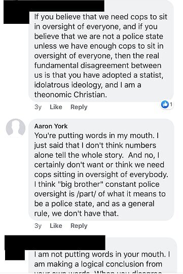 We have discovered multiple screenshots of discussions and arguments in which Mr. Dean engaged along these lines, both under his name and also under the name “Aaron York” (York is his middle name). This account has since been deactivated but his comments were preserved. These are all disclosed below. Ironically, it seems that even when he did approximate biblical limits on the use of power or force, he certainly did not hold himself to it. As can be seen, Mr. Dean was repeatedly warned and confronted by other theonomist, Christian reconstructionists in the forum who are typically well aware of the dangers of police brutality and unchecked power, but the message doesn’t appear to be getting through to Mr. Dean.